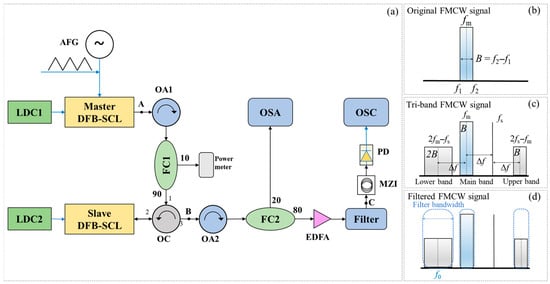 Figure 1a illustrates the experimental setup for a multi-band FMCW signal generator. A commercial distributed feedback semiconductor laser (DFB-SCL, GYSCIENTECH DFB-1550-02, Wuhan, China) with a Lorentz linewidth of 453.00 kHz is taken as the master DFB-SCL. Such a DFB-SL with specific linewidth is selected just for a proof of concept, and it can be predicted that the performances of the multi-band FMCW signal can be further enhanced if a DFB-SCL with a smaller linewidth is utilized. The bias current and temperature of the master DFB-SCL are controlled by a low-noise laser diode controller (LDC1, Koheron CTL-200-1-B600, Lorient, France), which possesses a current and temperature resolution of 0.015 mA and 0.1 °C, respectively. During the experiment, the bias current and temperature of the master DFB-SCL are set at 80.00 mA and 20.0 °C, respectively. After using a pre-distortion current generated from an arbitrary function generator (AFG, RIGOL DG1022z, Suzhou, China) to modulate the master DFB-SCL, the original FMCW signal is generated. The original FMCW signal is directly injected into a slave DFB-SCL (ETSC DFB-DC-13) for generating a multi-band FMCW signal after passing through an optical attenuator (OA), a 90:10 fiber coupler (FC1), and an optical circulator (OC), where the slave DFB-SCL is also a commercial device with no optical isolator and controlled by a laser diode controller (LDC2, Newport LDCX3724C, Newport, RI, USA), and its current and temperature resolution are 0.01 mA and 0.1 °C, respectively. During the experiment, the current of slave DFB-SCL is fixed at 60.04 mA. Through adjusting the temperature of slave DFB-SCL from 23.0 °C to 25.0 °C, different frequency detuning between the master and slave DFB-SCL can be obtained. After passing through the OC, OA, and an 80:20 FC2, the multi-band FMCW signal outputs from the slave DFB-SCL is divided into two parts. Twenty percent of the output is utilized for observation by an optical spectrum analyzer (OSA, BOSA Lite+, 20 MHz, Zaragoza, Spain). The remaining 80% of the output is passed through an Er-doped fiber amplifier (EDFA), a filter (EXFO, XTM-50-SCL-S, Quebec, QC, Canada), a Mach–Zehnder interferometer (MZI), a photodetector (PD, New Focus 1544-B 12 GHz, Sunnyvale, CA, USA), and an oscilloscope (OSC, Agilent-DSO-X910604A, Santa Clara, CA, USA) to extract the time–frequency curves of each band of the generated FMCW signal. The filter is utilized to capture the FMCW signals of different frequency bands, and the MZI consists of two 50:50 FCs and a 10 m fiber delay line.