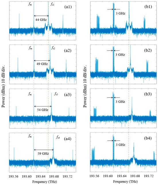 Firstly, we verified the tunability of this generator under a fixed amplitude of the pre-distortion current of 3V. In this part, the attenuation rate of the OA2 varies slightly in each recording process to ensure that each sideband is clearly presented. Therefore, the changes in power levels of each sideband are not given much attention. Figure 2(a1–a4) show the optical spectra measured at point B in Figure 1a under the master DFB-SCL without modulation. It can be seen that two additional spectral lines appear in the optical spectra of the slave DFB-SCL after introducing optical injection due to the FWM effect. The frequency interval between these spectral lines is consistent with the frequency detuning between the free-running master DFB-SCL (fm) and slave DFB-SCL (fs). The powers of the upper and lower sidebands are not identical, and such a phenomenon has been demonstrated in Ref. [30]. In addition, it can also be observed that, as the frequency of the slave DFB-SCL shifts from fs1 to fs4, the inter-band intervals between the four spectral lines gradually increase, and they always remain consistent with the frequency difference of fsi − fm. Furthermore, we apply a pre-distortion current with an amplitude of 3V to modulate the master DFB-SCL, and the corresponding results are recorded in Figure 2(b1–b4). It can be seen that the generated tri-band FMCW signals possess a relatively high signal-to-noise ratio (SNR), and SNRs are more than 25 dB for each band. The sweep-frequency bandwidth of lower band, main band, and upper band are around 6 GHz, 3 GHz, and 3 GHz, respectively. The inter-band intervals are 44 GHz, 49 GHz, 54 GHz, and 59 GHz, respectively. From Figure 2(a1,b1), it can also be observed that there is an obvious bump near fs, which is due to the enhanced relaxation oscillation of slave DFB-SCL under optical injection with a relatively small frequency detuning [28]. With the increase in frequency detuning, the effect of enhanced relaxation oscillation originating from optical injection is generally weakened, and such a bump is gradually suppressed.
