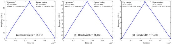Considering that the performance of the generated tri-band FMCW signal is seriously dependent on the original FMCW signal, we first analyzed the performance of the original FMCW signal under sweep-frequency bandwidths of 3 GHz, 5 GHz, and 7 GHz, and the corresponding results are shown in Figure 3. In this work, 80% of the region of interest of the recorded time-varied frequency signal is taken to analyze. The linear regression coefficient is calculated as R2 = 1 − SSres/SStot, where SSres is the sum of squared residuals, SStot is the total sum of squares, and R2 is a constant less than 1. The higher the linearity, the closer R2 is to 1. The residual root-mean-square error (RMSE) is represented as an RMS of the difference between the swept-frequency optical signal and a standard linear fitting curve, and it can be expressed as RMSE = √(SSres/N), where N is the number of points of SSres. For the sweep-frequency bandwidth setting at 3 GHz, the R2 for up- and down-ramp FMCW signals are 0.9994 and 0.9998, respectively, and their corresponding RMSEs are 16.0980 MHz and 10.4805 MHz. For the sweep-frequency bandwidth increasing to 5 GHz, the R2 for up- and down-ramp FMCW signals are 0.9995 and 0.9998, respectively, and their corresponding RMSEs are 24.0890 MHz and 16.3450 MHz. For the sweep-frequency bandwidth fixing at 7 GHz, the R2 for up- and down-ramp FMCW signals are 0.9999 and 0.9999, respectively, and their corresponding RMSEs are 18.8100 MHz and 6.8633 MHz. The results indicate that the down-ramp possesses a relatively high linearity over the up-ramp, and the reason is that the linearity of the down-ramp is better than that of the up-ramp under conditions without pre-distortion. Additionally, there exists a distortion point between the up- and down-ramp, which results from the relaxation oscillation of the laser [32].