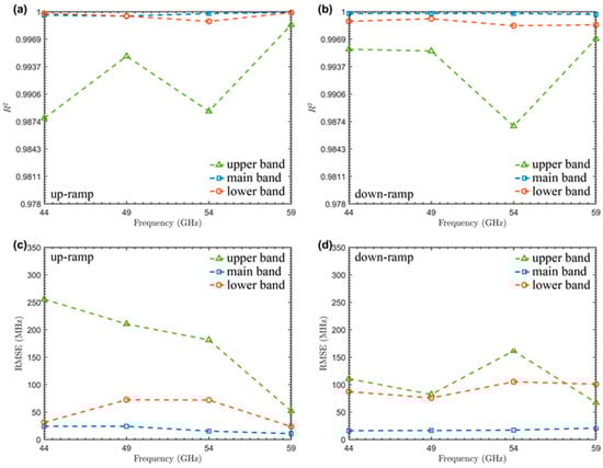 Next, by injecting the aforementioned original FMCW signal with a sweep-frequency bandwidth of 3 GHz into the slave DFB-SCL, we investigated the R2 and RMSE of the tri-band FMCW signal under different inter-band intervals. Figure 4a,b show the R2 for up and down-ramp tri-band FMCW signal under the inter-band interval of 44 GHz, 49 GHz, 54 GHz, and 59 GHz, respectively. It can be observed that the regenerated original FMCW signal can maintain excellent performance, followed by the lower band FMCW signal with a higher SNR of about 30 dB in the optical spectrum. However, due to the relatively low SNR of the upper band FMCW signal of about 15 dB, its performance is the poorest. Figure 4c,d show the RMSEs for up and down-ramp tri-band FMCW signals under the inter-band interval of 44 GHz, 49 GHz, 54 GHz, and 59 GHz, respectively, and similar results can be concluded. In addition, for the inter-channel spacing is fixed at 59 GHz, each band of the tri-band FMCW signal has an excellent performance. The reason is that the larger the frequency spacing, the less the spectral distribution near the center frequency of slave DFB-SCL is affected by the injection light [28]. As a result, these sidebands possess better performance in linearity under a larger frequency spacing.