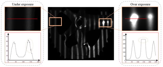 For diffuse or moderately reflective surfaces, SL systems typically achieve robust phase inversion and high reconstruction accuracy. In contrast, on metallic, electroplated, or mirror-coated surfaces, specular reflection causes severe local overexposure or even complete loss of fringe patterns, disrupting the spatial texture and frequency structure of the projected sinusoidal illumination. This instability in phase extraction leads to a significant reduction in reconstruction accuracy [4]. As illustrated in Figure 1, the projected sinusoidal fringes on a highly reflective surface suffer from two typical exposure distortion modes: underexposure and overexposure. The middle image shows an example of an acquired fringe pattern where non-uniform surface reflectance results in pronounced spatial fluctuations in fringe intensity. The left magnified region corresponds to an underexposed area, where fringe contrast becomes extremely low and gray intensities remain within a narrow dynamic range, causing irreversible loss of phase transition information. Conversely, the right magnified region demonstrates overexposure, where saturated highlight responses produce “fringe discontinuities” or plateau-like saturation segments, destroying the sinusoidal distribution and compromising accurate phase computation. Therefore, it is of great significance to develop fringe restoration or enhancement methods with strong high-dynamic-range adaptability to mitigate the exposure-induced phase distortion and improve the robustness and practicality of SL-based 3D measurement for highly reflective surfaces.