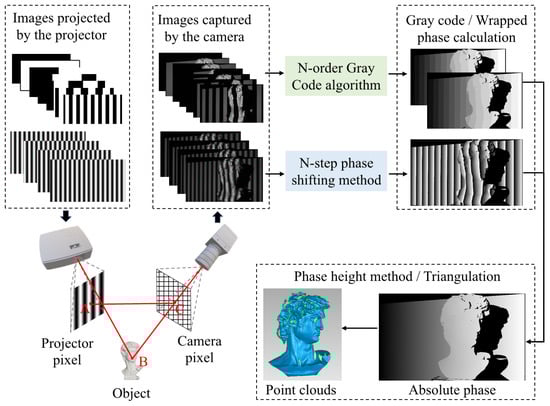 SL three-dimensional reconstruction adopts an active projection strategy in which a projector casts pre-designed encoded fringe patterns onto the target object’s surface, while a camera synchronously captures the deformed patterns modulated by the object’s geometry and reflectance [20]. The projected patterns are typically displayed in a temporal sequence and serve as temporarily imposed surface textures, enriching geometric cues and significantly enhancing feature extraction and correspondence establishment, particularly for texture-deficient regions. By analyzing the spatial displacement or phase shift of the captured fringe patterns, the spatial correspondence between the projector and camera can be robustly estimated, enabling high-precision 3D geometry recovery and yielding dense depth maps or point clouds.
