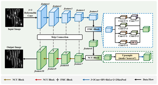Furthermore, shallow encoder features (feature1∼feature4) are fused with decoder-stage features (feature7∼feature10) to better preserve fine-grained texture details and high-frequency structural information. A final convolution layer maps the decoder output to a single-channel reconstructed fringe image.