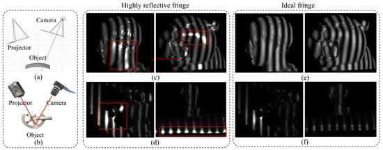 For each object, two sets of images were rendered: (i) a highly reflective (specular) version, serving as the network input. To improve the model’s adaptability to different surface reflectance conditions, the virtual dataset was constructed with varied material reflectance levels, including specular metal, electroplated surfaces, and diffuse ceramic/plastic targets. Illumination intensity and exposure settings were also adjusted to simulate typical fringe degradations such as saturation, dimming, glare, and contrast loss; (ii) a diffuse surface version, used as the supervision target. The resulting virtual dataset therefore consists of paired high-reflectance fringe patterns and their ideal reference images, providing training data for robust fringe restoration. Representative examples are shown in Figure 5c,e.