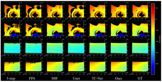 Table 1 reports the quantitative results of five representative methods, including 3-step, 12-step, DcMcNet, TC-Net, and our approach. A lower MAE [24] indicates that the reconstructed depth map is closer to the ground-truth distribution, thus reflecting the deviation in global reconstruction accuracy. Conversely, a SSIM [25] value closer to 1 signifies higher structural similarity between the predicted and reference depth maps.