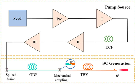 Figure 1 illustrates the cascaded experimental setup, which comprises a picosecond-pulsed TDFA, a GDF, and a TBY. The initial pulsed laser was generated by a mode-locked seed oscillator based on a semiconductor saturable absorber mirror (SESAM). The mode-locked oscillator has a repetition rate of 44.31 MHz, a pulse width of 29.7 ps, a central wavelength of 1998 nm, a 3 dB spectral bandwidth of 0.3 nm, and an output power of 4 mW. This pulse train was then amplified using a TDFA that incorporated multistage amplification and dispersion management techniques. A preamplifier is incorporated between the thulium-doped fiber amplifier and the mode-locked seed source. Specifically, a dispersion compensation fiber (DCF) was integrated into the amplifier to broaden the pulse width. This reduction in peak power effectively mitigated nonlinear effects during the subsequent amplification stages. The TDFA delivered picosecond pulses at a wavelength of approximately 2 μm and a repetition rate of 44.31 MHz, serving as the primary pump source for two sequential nonlinear conversion stages. The pump beam was first launched into an 18 cm long GDF with a core diameter of 12 μm. The GDF was fusion-spliced directly to the TDFA output fiber, forming an all-fiber, high-power first stage. The output from the GDF was then mechanically butt-coupled into a 35 cm long TBY with a core diameter of 7 μm. The cascaded configuration ensured a stepwise increase in fiber nonlinearity, effectively maintaining the soliton state of the pulse. The alignment between the GDF and TBY was optimized using a high-precision three-dimensional translation stage. This alignment process was guided by monitoring the output power and beam profile characteristics with a high-resolution charge-coupled device (CCD) camera. The GDF output end was cleaved at 8°, while the TBY ends were polished to an 8° angle. All fiber components were mounted on water-cooled plates for effective thermal management during operation.