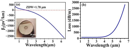 The short GDF was employed as the primary nonlinear medium for spectral broadening. This fiber featured a core diameter of 12 µm and a GeO2 concentration of 64 mol.%. Additionally, the GDF exhibits relatively low loss in the 2~3 µm region, with a sharp increase in loss observed at wavelengths exceeding 3 µm [11]. We used a TBY with a 7 μm core diameter (cross-section shown in the inset of Figure 2a). This fiber has a nonlinear coefficient of 155.13 W−1 km−1 at 2 μm, as calculated from its nonlinear refractive index. In our research, the GDF used in our experiments was purchased from a specialized fiber manufacturer. The second nonlinear fiber utilized is a TBY self-drawn using a combination of the suction injection method and the rod tube method, with dispersion controlled by adjusting the core size. The fiber core and inner cladding glass components are TeO2:BaF2:Y2O3 ratios of 70:20:10 and 65:25:10, respectively [16]. As presented in Figure 2a, the zero-dispersion wavelength (ZDW) for the fundamental Linearly Polarized mode 01 (LP01) mode is 1.78 μm. Since the pump source operates in the anomalous dispersion regime beyond this ZDW, it is well-suited for exciting strong nonlinear effects. Furthermore, the confinement loss curve in Figure 2b confirms that the fiber maintains low loss across the mid-infrared band, making it ideal for MIR SC generation [17].