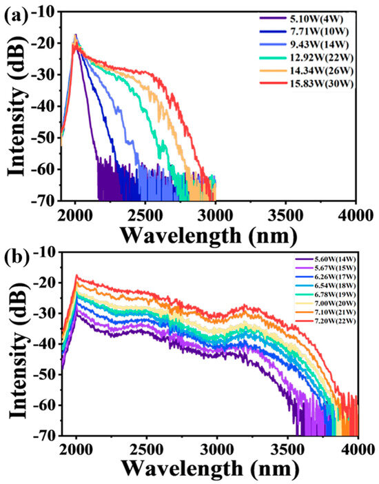 After pre-amplification, the pulsed laser from the seed oscillator had a 3dB spectral width of 0.4 nm and an output power above 1 W. The pulses were then temporally stretched in a 100 m dispersion-compensating fiber (UHNA4, Coherent (Nufern), East Granby, CT, USA) and further amplified in a single-mode TDFA (home-made) to increase the average power. When pumped with a 793 nm laser diode (LD, BWT Beijing Ltd., Beijing, China) at 22 W, the amplifier delivered an output power of 15.20 W; the spectrum measured using a grating monochromator spanned from 1.8 to 2.2 μm. The maximum output power reached 18.50 W at a pump power of 30 W, with further power scaling limited by the available pump power. Based on the optimization of the aforementioned parameters, we enabled the pump pulses to achieve sufficient peak power while delivering high average power, thereby facilitating effective spectral broadening in the subsequent nonlinear fibers. A trade-off among the pulse parameters of the pump source is necessitated during the experiment. Increasing the repetition rate facilitates the enhancement of average power but may compromise the broadening efficiency in the long-wavelength region. The pulse width directly determines the peak power and excites distinct nonlinear effects in nonlinear fibers. This TDFA was used to pump an 18 cm long GDF (Coherent (Nufern), East Granby, CT, USA) (64 mol.%). The splice loss between the TDFA and the GDF was measured at 0.2 dB. The output power and spectral evolution after the GDF are shown in Figure 3a. The output power increased linearly with pump power without saturation, achieving a slope efficiency of 42.2% relative to the pump power of the main amplifier. At the maximum pump power of 30 W, the output power after the GDF was 15.83 W. As the output power rose, the SC spectrum from the GDF broadened progressively toward longer wavelengths. However, further broadening was constrained by the available pump power and the material loss of the GDF at longer wavelengths. At an output power of 12.92 W, the long-wavelength edge of the SC extended to ~2.7 μm. At 15.83 W, the long-wavelength edge reached approximately 3 μm, with a spectral absorption peak observed at 2.7 μm due to water molecules. The primary broadening mechanisms included self-phase modulation, modulation instability, higher-order soliton fission, and soliton self-frequency shift [18,19].