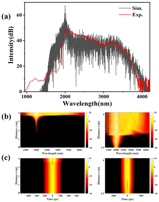 The theoretical model comprises a 3.5 m gain fiber, an 18 cm GDF, and a 35 cm TBY. For accurate resolution in both spectral and temporal domains, a grid of 219 points and a 3000 ps time window were used in the simulations. Furthermore, Gaussian white noise was incorporated into the model to enhance the reliability of the results and improve their agreement with experimental data. We took these parameters for numerical simulation using MATLAB, including an operating wavelength of 2 μm, a pulse width of 29.7 ps, and a repetition rate of 44.3 MHz of the pump source; the calculated nonlinear coefficients of GDF, GVD profile, and loss curve derived from Ref. [11]; the calculated nonlinear coefficients of TBY, GVD profile, and loss curve mentioned in Figure 2; and the Raman response function derived from the Raman gain spectrum of GDF and TBY glass [22]. The GDF and TBY have a nonlinear coefficient of 3.74 W−1 km−1 and 155.13 W−1 km−1 at 2 μm. For the simulation of GDF, our previous study reveals the physical mechanisms by which modulation instability leads to pulse splitting and how soliton dynamics and soliton self-frequency shift achieve spectral broadening [11]. At the same injected pump power, the simulation results (black curve) agree well with the experimental results (red curve) of the SC spectrum measured through the TBY, indicating that the parameters used in the simulation are appropriate, as shown in Figure 5a. Furthermore, the frequency-domain and time-domain evolution processes of SC generation were simulated, as shown in Figure 5b,c, along with detailed evolution profiles after a propagation distance of 3.5 m. Due to modulation instability, the pulse developed distinct symmetric sidebands on both sides of the central wavelength at 1.6 m in the gain fiber, while the pulse within the thulium ion gain spectrum was amplified. After propagating through a certain length, as shown in Figure 5c, the pulse splits into a series of ultrafast sub-pulses at the 3.5 m position within the gain fiber. As the pulse continued propagating in the GDF fiber, modulation instability gradually intensified, exciting abundant soliton dynamics in the TBY. Subsequently, soliton pulses with high peak power further induced modulation instability, soliton fission, and soliton self-frequency shift (SSFS) in the 35 cm long TBY, which broadened the spectrum to longer wavelengths.