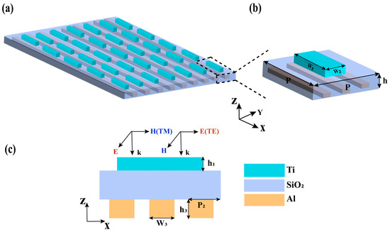 The proposed polarization-sensitive MA consists of a bilayer nanostructure comprising a top Ti nanorectangle array layer, a middle dielectric SiO2 layer, and a bottom Al gratings layer, as shown in Figure 1. The structural parameters of P1, H1, W1, and W2 denote the period, height, length, and width of the top Ti nanorectangle array and the optimized values are 360 nm, 60 nm, 280 nm, and 100 nm, respectively. P2, H3, and W3 represent the period, height, and width of the bottom Al gratings, and the optimized values are 120 nm, 160 nm, and 40 nm, respectively. The thickness of the middle SiO2 layer is expressed by H2 with optimized values of 100 nm. The refractive index of the SiO2 dielectric layer is 1.45 [24]. The complex refractive indices of Al and Ti are taken from the Drude–Lorentz model [25], and the details of the data can be checked in the Supporting Information. In order to characterize the optical absorption performance of the proposed polarization-sensitive MA, we utilized the finite element method (FEM) to perform the numerical calculations (COMSOL Multiphysics Version 6.3). During simulation, the boundary condition along the x- and y-axis is set to be periodic; we also adopted the perfectly matched layer (PML) along the z-axis for the purpose of eliminating boundary scattering generated by the structure. Transverse magnetic (TM) polarization refers to the magnetic field perpendicular to the direction of propagation, while transverse electric (TE) polarization is an electric field whose vibration direction is in the plane perpendicular to the direction of propagation [26]. Here, TE- and TM-polarized light are used as excitation sources and incident perpendicularly along negative z-axis onto the configuration. All numerical calculations employ an adoptive fine mesh setting. The absorption can be calculated by the following equation [27]: