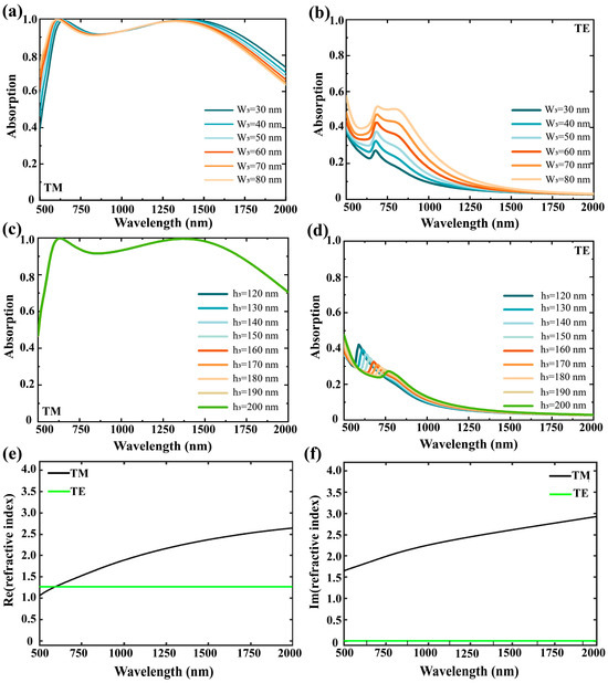 To further explore the effects of the bottom Al gratings’ geometric parameter variations on the absorption of the designed polarization-sensitive MA, we simulated the absorption spectra under the illustration of TE- and TM-polarized light, respectively. The calculated results are shown in Figure 3a–d. Figure 3a,b display the absorption performance dependent on the gratings’ width for TM- and TE-polarized light, respectively. In Figure 3a, for TM-polarized light, the absorption of the proposed polarization-sensitive MA increases gradually as the bottom gratings’ width becomes larger at the short wavelengths of 500–630 nm. In the wavelength region of 630–1370 nm, the absorption of the polarization-sensitive MA is almost unchanged with the variations in the bottom gratings’ width. However, for larger wavelength of 1370–2000 nm, the absorption decreases gradually as the width of the bottom Al gratings increases. As for the case of TE-polarized light shown in Figure 3b, when the incident wavelength lies approximately in the range of 500–1500 nm, the absorption of the polarization-sensitive MA increases gradually as the width of the bottom gratings increases. Additionally, approximately from the point of the wavelength of 1300 nm, the absorption of the polarization-sensitive MA remains unchanged while the absorption of the bottom gratings varies. The absorption of the polarization-sensitive MA affected by the height of the bottom Al gratings are exhibited in Figure 3c,d. When the illumination wave source is TM-polarized light, there is no change in the absorption of the polarization-sensitive MA while the height of the bottom gratings varies. For the case of TE-polarized light, the absorption peak has a red-shift with the increased height of the bottom gratings, and the absorption remains almost unchanged from the start of the wavelength of 1250 nm. Namely, there is little variation in the wavelength region of 1250–2000 nm.