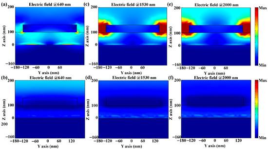 (a,c,e) Distributions of the electric field (|E|) in the Y-Z plane at the wavelengths of 640, 1530, and 2000 nm under TM-polarized light excitation. (b,d,f) Distributions of the electric field (|E|) in the Y-Z plane at the wavelengths of 640, 1530, and 2000 nm under TE-polarized light excitation.