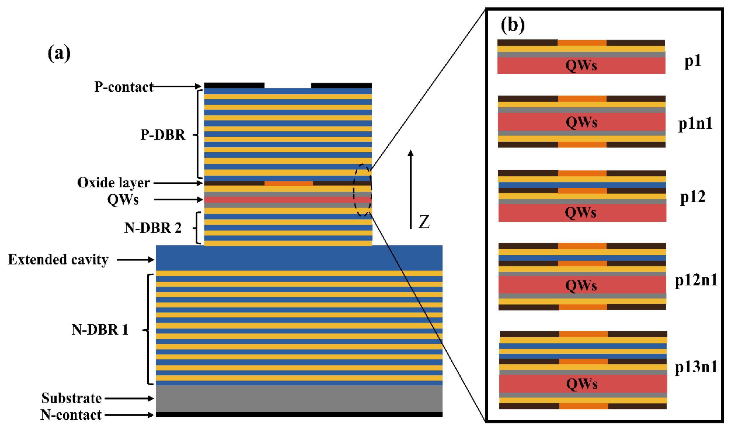 Figure 1b), including p1, p1n1, p12, p12n1, and p13n1. p1 represents a single p-type oxide layer located at the first wave valley of the standing wave above the first resonant cavity; p12 represents two p-type oxide layers located at the first and second wave valleys of the standing wave above the first resonant cavity; p13 represents two p-type oxide layers located at the first and third wave valleys of the standing wave above the first resonant cavity; n1 represents a n-type oxide layer located at the first wave valley of the standing wave below the resonant cavity. Thus, p1n1 represents a structure that includes one p-type and one n-type oxide layer, located at the first wave valley above and below the resonant cavity, respectively, as indicated by the blue vertical lines in