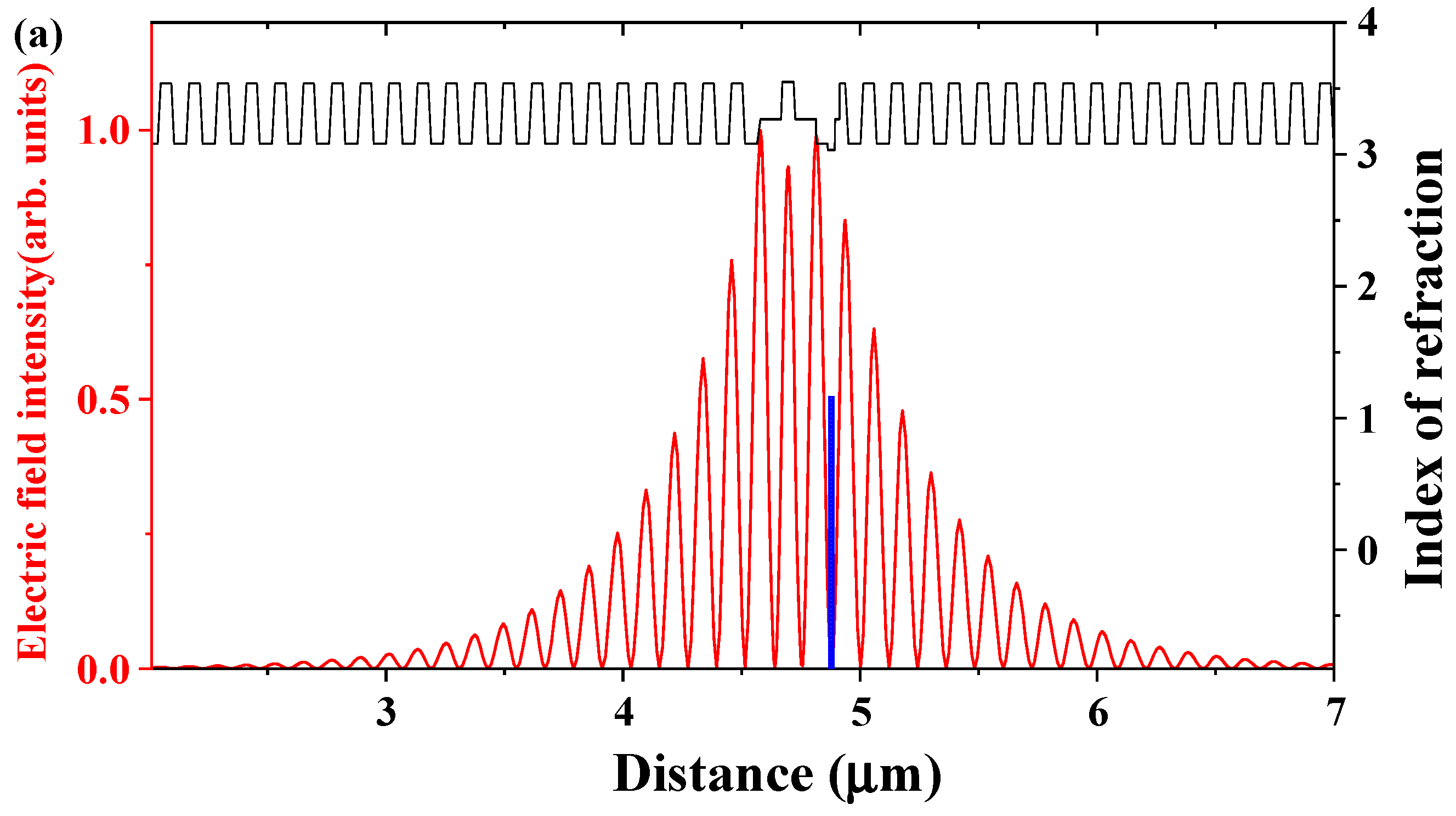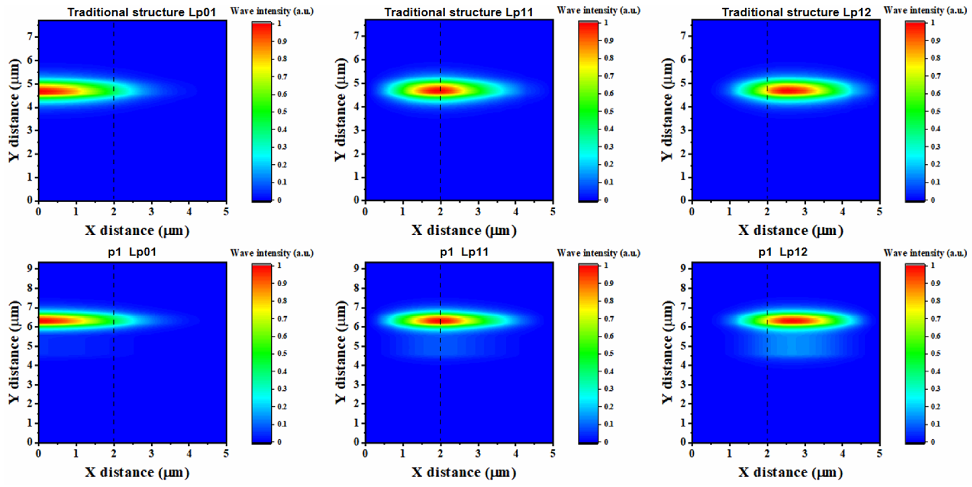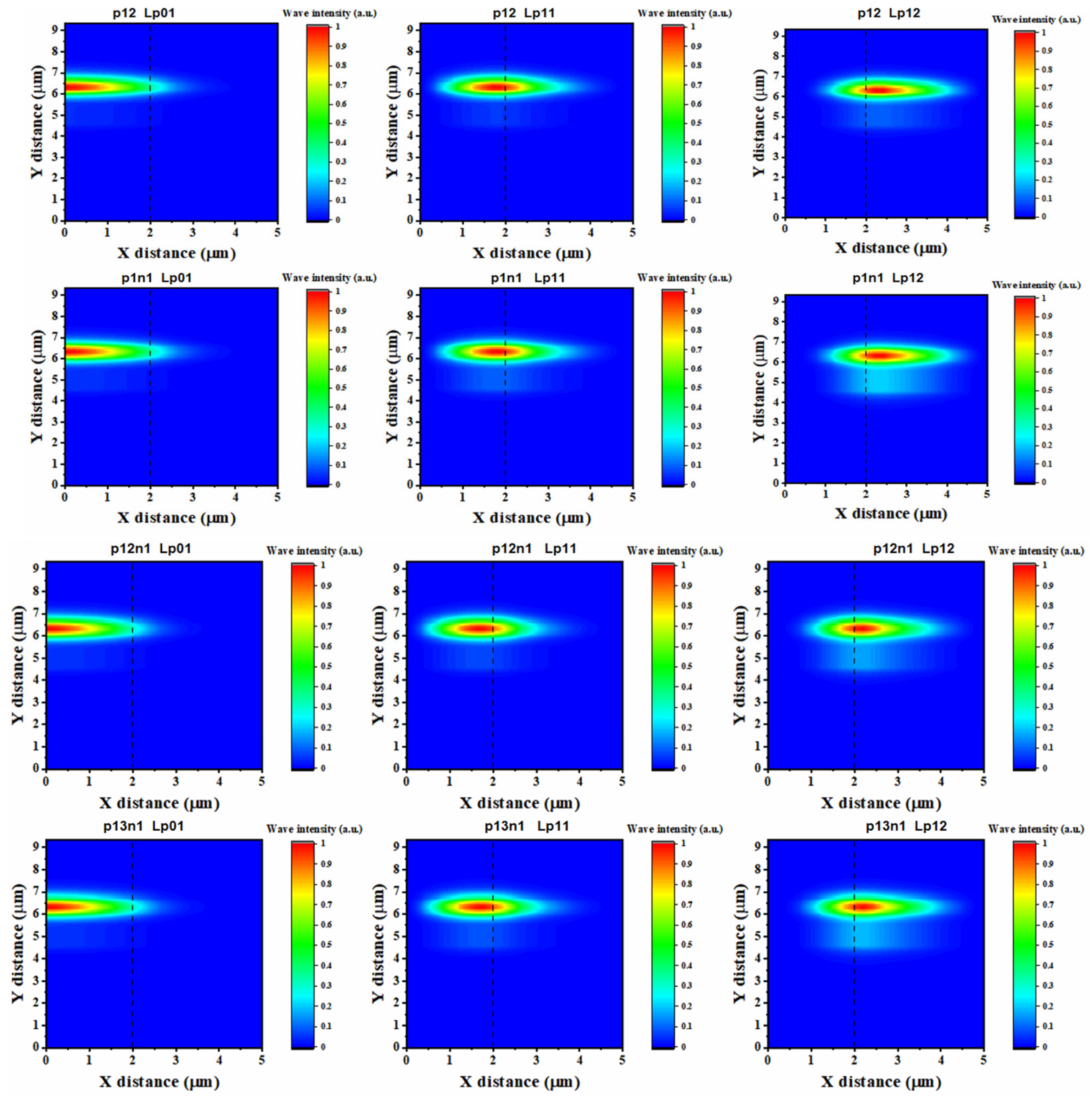 Ez represents the standing wave distribution of the electric field along the Z-direction and as ncore and nclad are the effective refractive indices of the core and cladding materials, respectively, then ∆neff = Ncore − Nclad. According to these formulas, ∆neff increases with the increase in the number of oxide layers. Using this model, the ∆neff values for the traditional structure, p1, p12, p1n1, p12n1, and p13n1 are calculated to be 0.0014, 0.0011, 0.0022, 0.0023, 0.0033, and 0.0031, respectively.