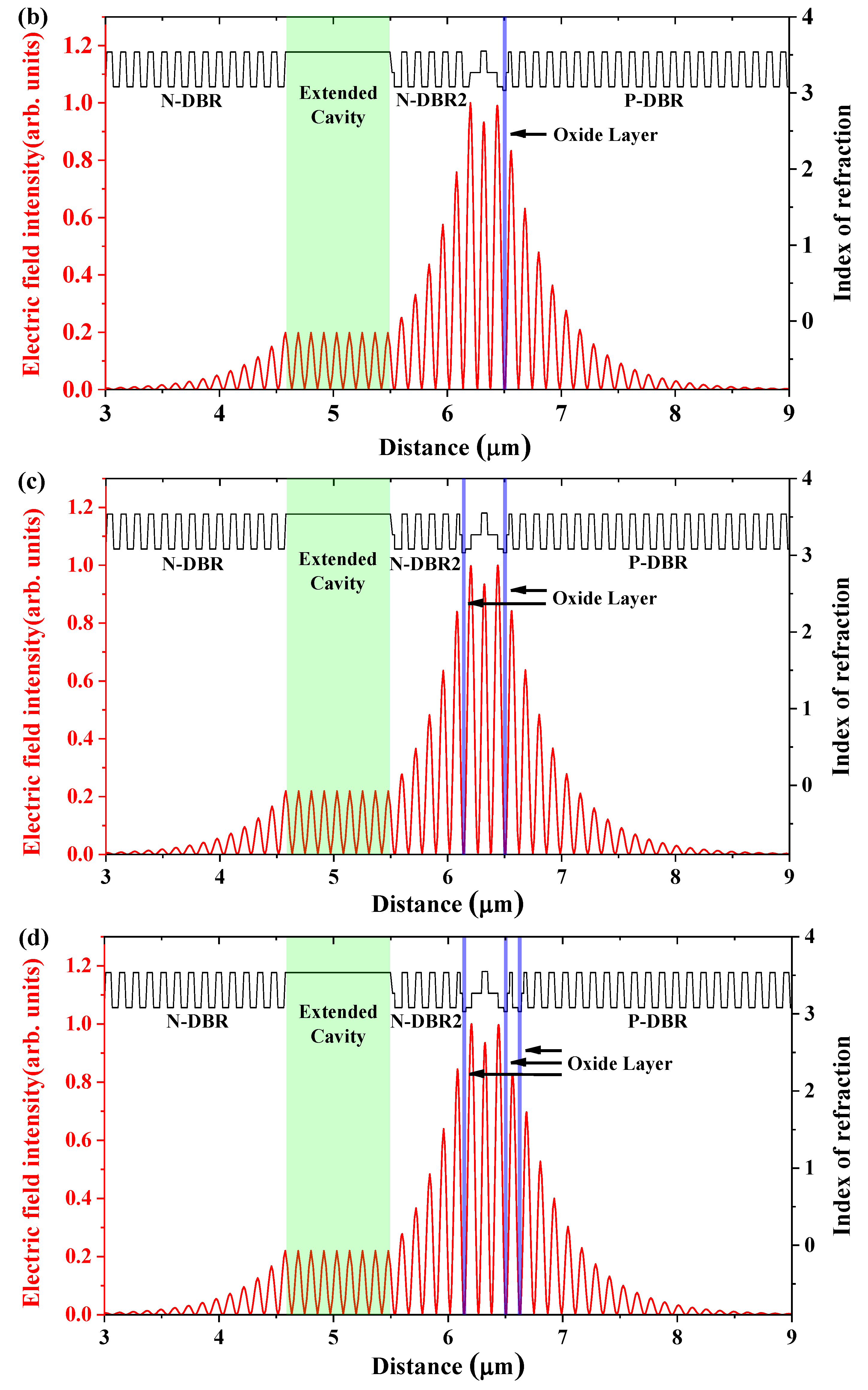 26], thereby suppressing the formation of high-order transverse modes, which is beneficial for the improvement of SMSR; secondly, multi-oxide layers enhance the optical field confinement [
