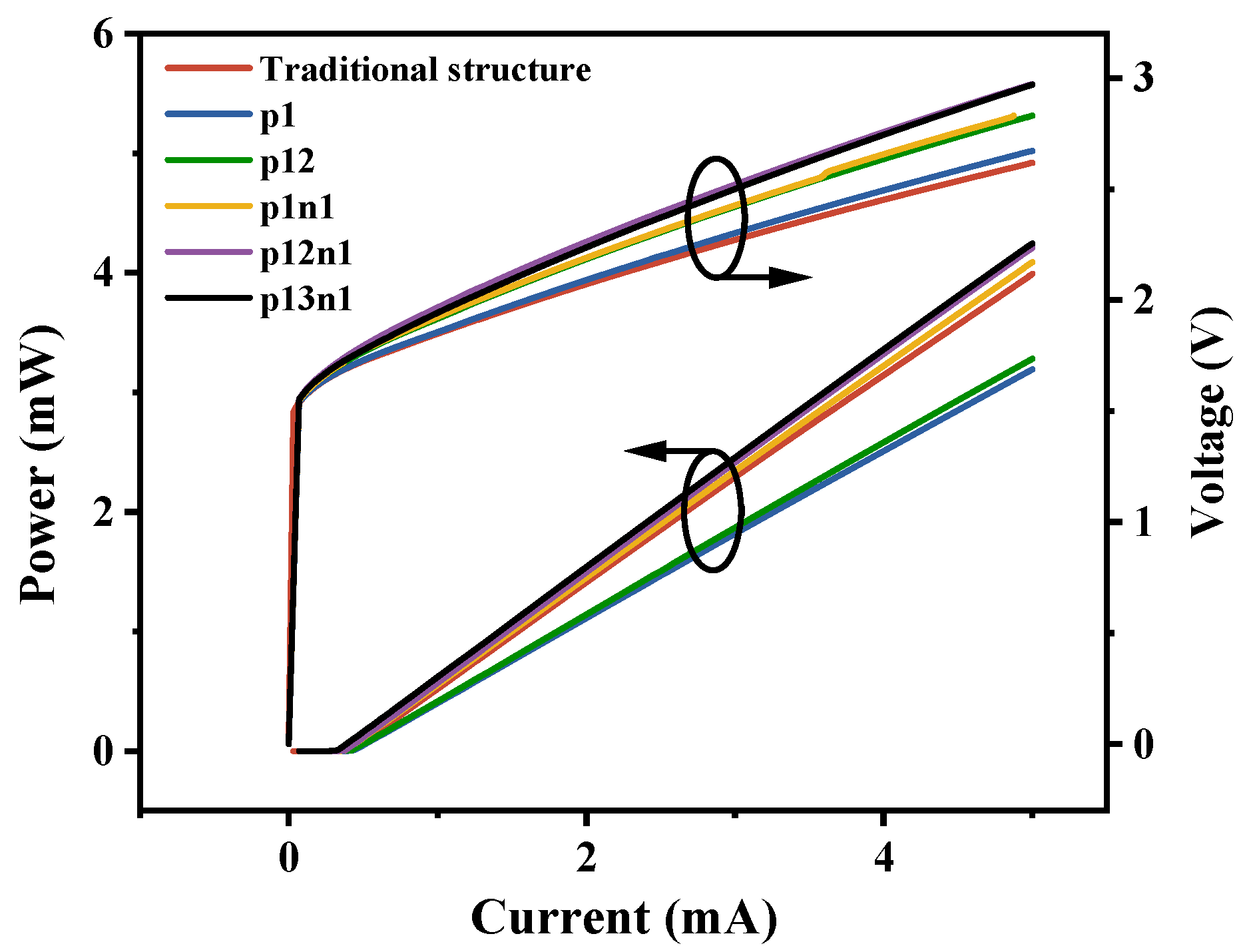 Figure 3 that with an increase in the number of oxide layers, the slope efficiency and output power increase simultaneously, while the threshold current decreases. In particular, when the n-type oxide layer is introduced, the slope efficiency and output power are significantly improved and the threshold current also decreases, as expected. The formulas for threshold current, slope efficiency, and output power are as follows: