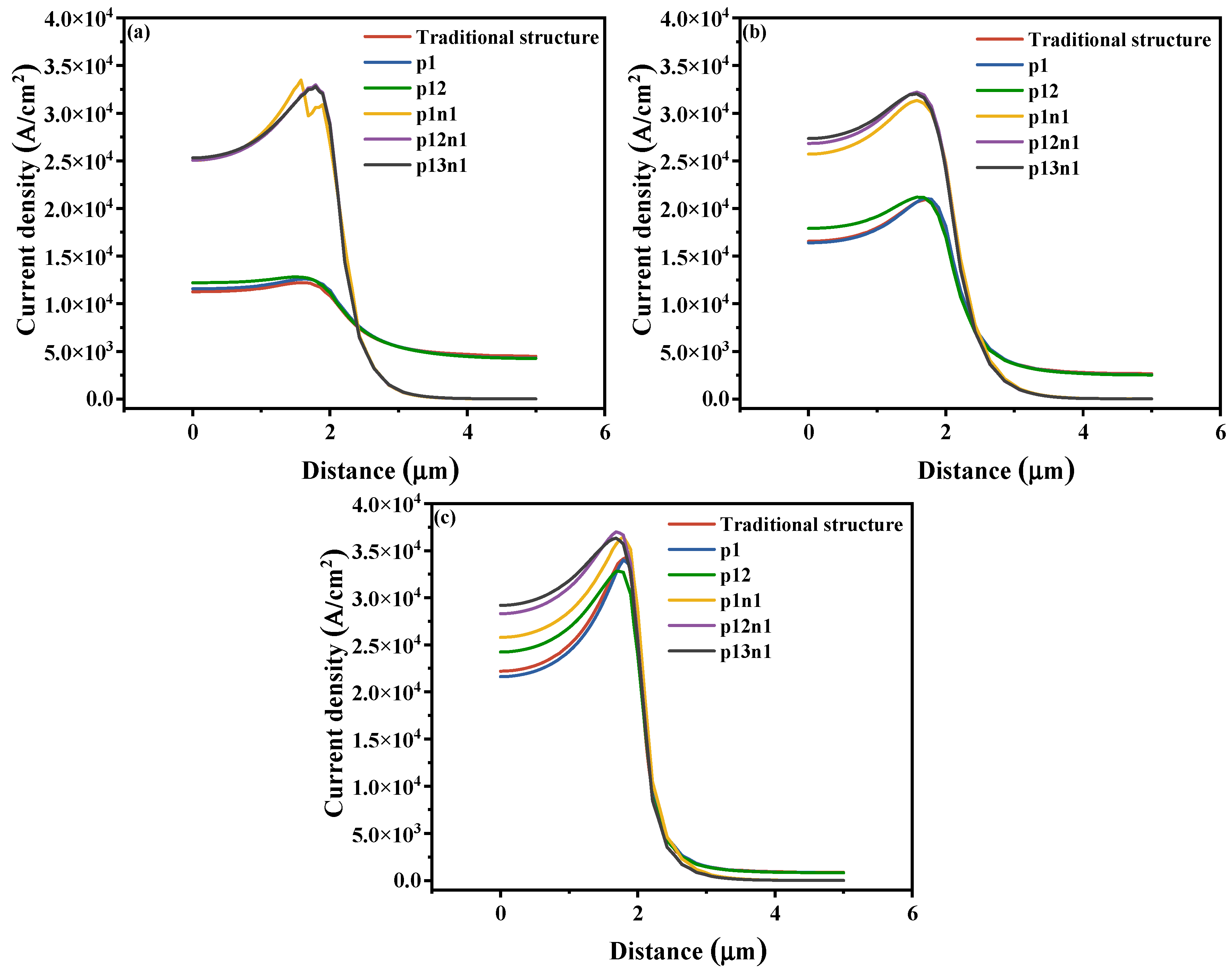 Figure 4 presents the current density distributions along the radial direction of the VCSEL cylinder for the three quantum wells in the active region. The first quantum well is the bottommost one (close to the n-type doped region); the second is in the middle; and the third is the topmost one (close to the p-type doped region). The current densities of the traditional structure, p1, and, p12 show a gradient distribution, with the current density being the lowest in the first quantum well, medium in the second, and the highest in the third. This gradient distribution is due to the low hole mobility. Since only p-type oxide layers are present in these three structures, they can only confine the hole current. However, due to the low hole mobility, most holes are concentrated in the third quantum well and only a small number are transported to the first two quantum wells, resulting in the current density gradient. The current densities of structures p1n1, p12n1, and p13n1 are uniformly distributed among the three quantum wells with no obvious variations. It can be seen that after the introduction of the n-type oxide layer, the electron current density in the active region is significantly increased, and the electron mobility is much higher than that of the hole, so the electron currents in the three quantum wells are almost the same. More importantly, the current density in the structures with both p-type and n-type oxide layers is significantly higher than that in the structures without the n-type oxide layer. A higher current density leads to a higher carrier concentration, which means a higher carrier injection efficiency and this is also the main reason for the increase in slope efficiency. When the carrier concentration injected into the active region increases, the gain of the active region also increases, and thus the threshold current decreases. In summary, the adoption of a p-type oxide layer can improve the hole injection efficiency and hole current density, while the adoption of an n-type oxide layer can enhance the electron injection efficiency and electron current density. In the case of only a p-type oxide layer, the increase in current density and carrier concentration is scant. When both p-type and n-type oxide layers are used, the electron current and hole current densities increase simultaneously, leading to a significant increase in injected carrier concentration. Consequently, the gain of the active region is remarkably improved and ultimately the output power of the device is greatly enhanced.