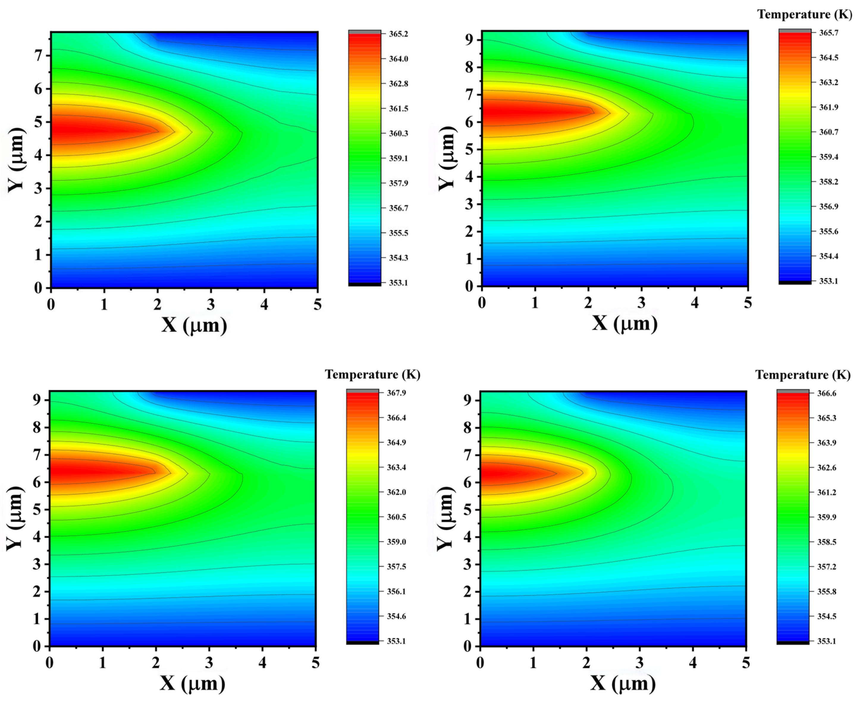 Figure 5 depicts the cross-sectional 2D temperature distribution mapping obtained from the simulation. Contrary to expectations, within the range of the oxide aperture, the radial temperature variation is marginal and the corresponding radial variation in refractive index is thus negligible. For this reason, the thermal lensing effect is not reflected in this study. Similarly, due to the small temperature variation range, other temperature-related parameters remain almost unchanged. Therefore, the influence of thermal effects on the optoelectronic performance of VCSELs can be neglected in this study.