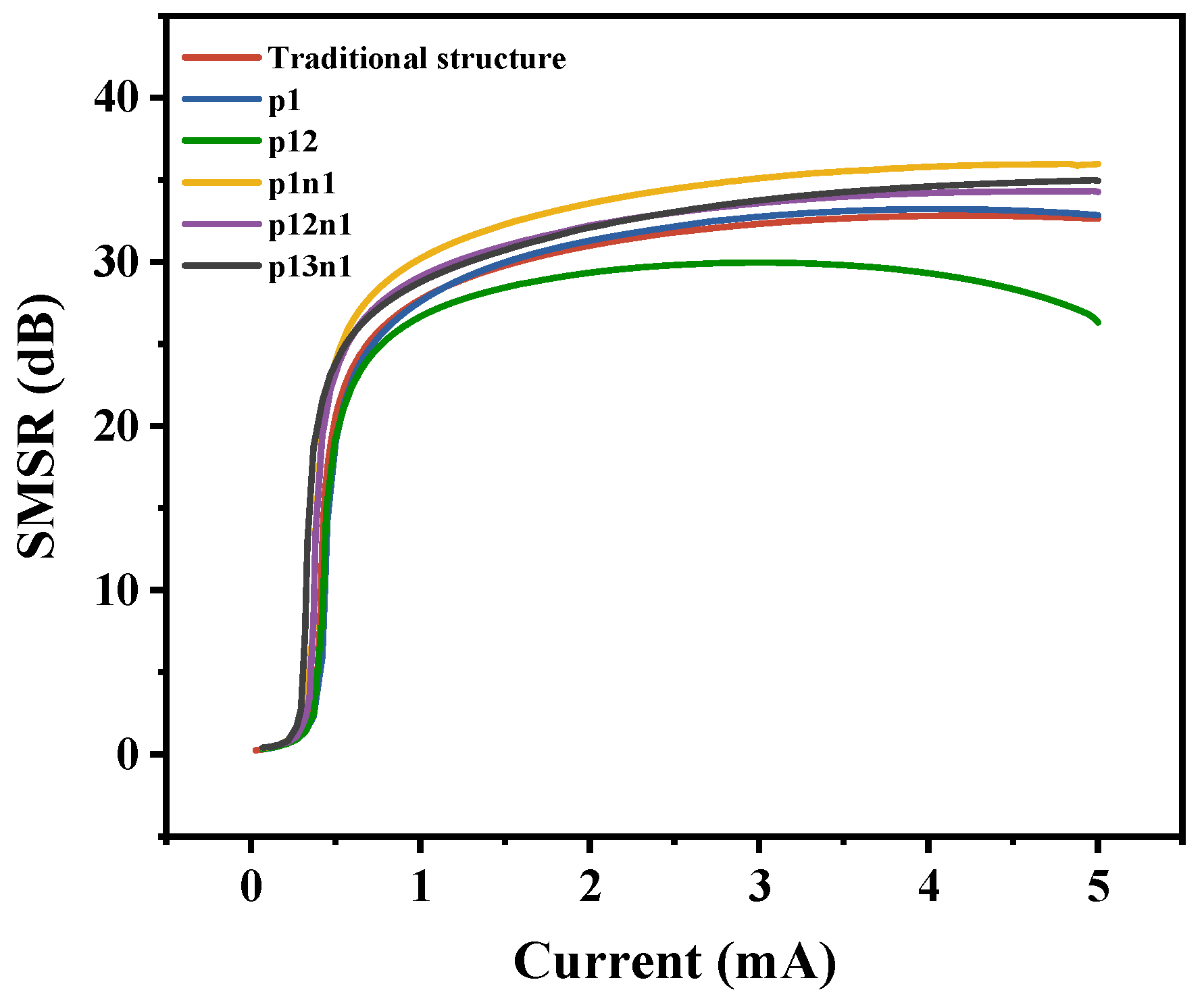 p13n1 is similar to p12n1, but its topmost p-type oxide aperture is farther from the active region. This not only weakens the optical field confinement but also increases the diffraction loss. The two effects ultimately result in a larger SMSR for p13n1 compared to that of p12n1 and traditional structures.