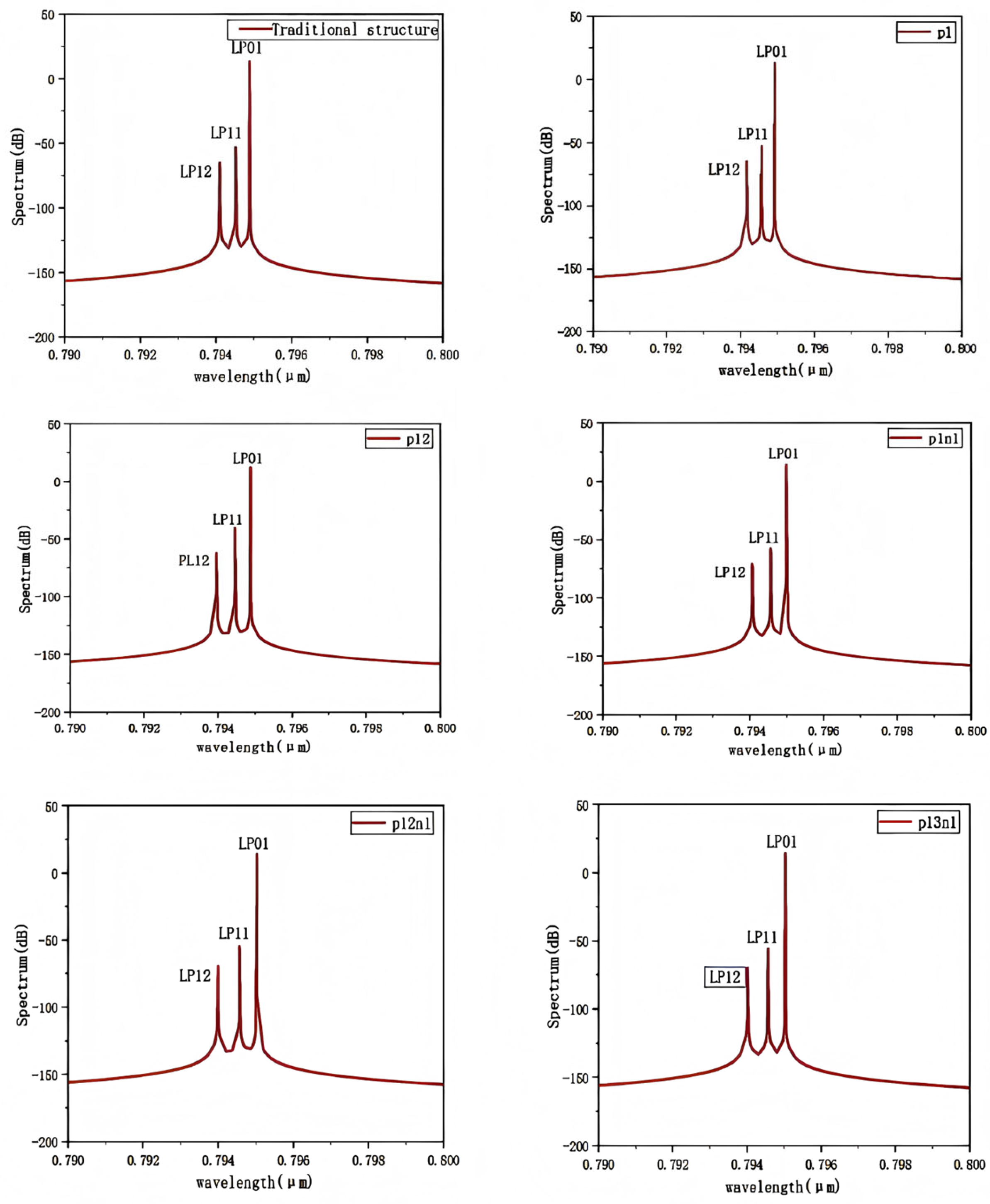 p1n1 is also similar to p12n1 and p13n1, but the ∆neff of p1n1 is 0.0023, much smaller than that of p13n1, so the confinement of high-order transverse modes is much lower than that of p13n1, leading to a further increase in the SMSR.