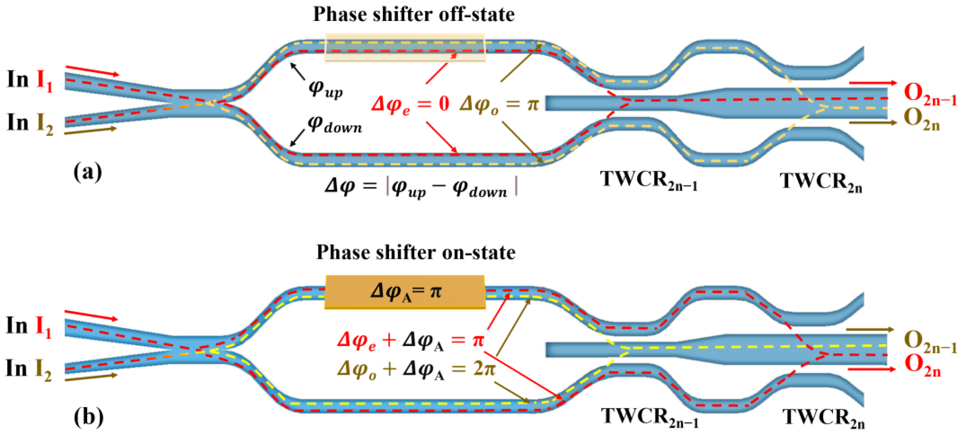 Figure 1a, a reconfigurable and broadband adiabatic TWC mode switch was designed on a silica platform with a 2% index contrast. The operating wavelength was set to 1550 nm, corresponding to refractive index of 1.4737 for the core layer and 1.4448 for the cladding layer. The input combiner of the device adopts an adiabatic coupling design, whereas the combiner following the modulation arm adopts a TWC design. This three-waveguide coupling region (TWCR) consists of four TWC sections (TWCR