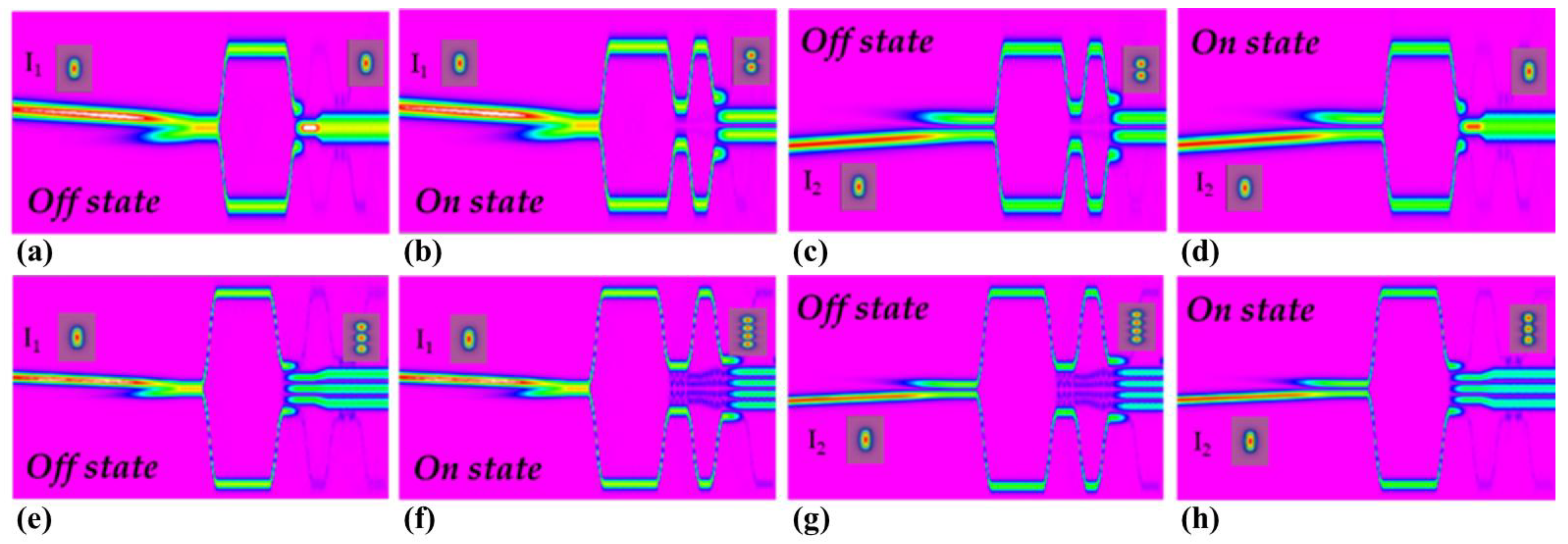 29]. The response speed can be reduced by reducing the thickness of the top cladding layer. The mode switch designed in this paper has the advantages of low transmission loss and a high mode extinction ratio, hence it has broad application prospects in MDM systems.