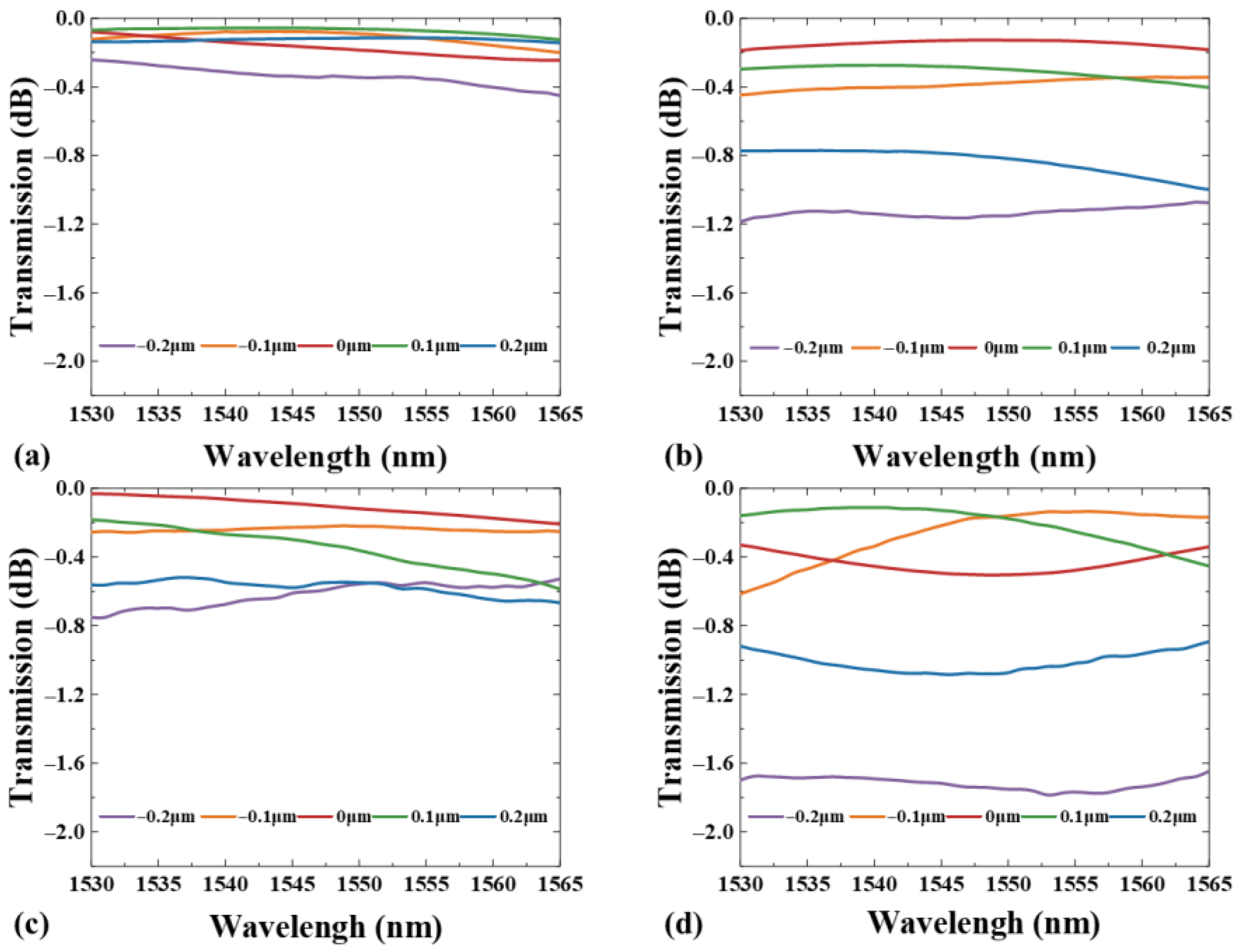 Figure 10a–d show the device’s transmission spectra, where when the E