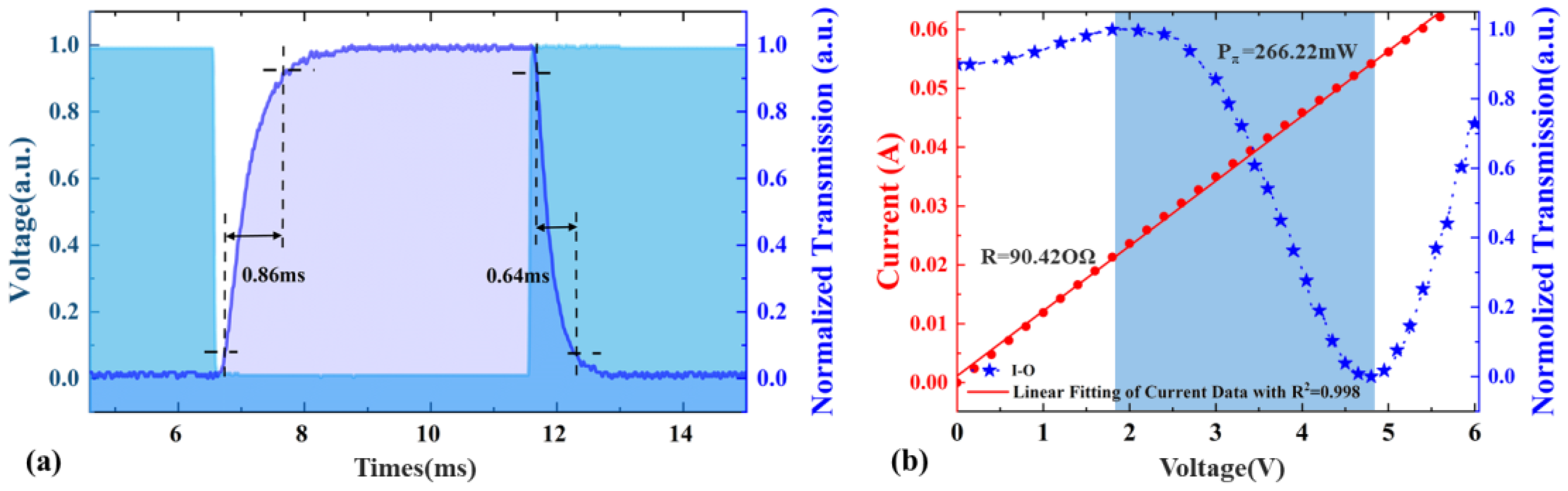 30 mode-selective switches are tested; since they share the same platform materials, their response speeds are essentially identical. Additionally, the current–voltage (I–V) and optical power–voltage (O–V) characteristic curves of the switch are measured, shown in
