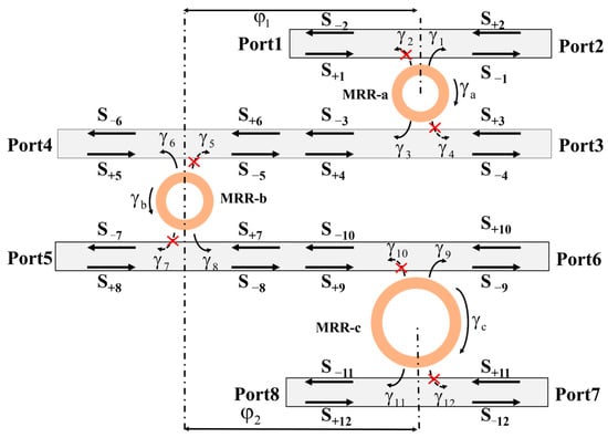 where (i = 1, 2, 3) corresponds to the intracavity resonant mode amplitudes , and in MRR-a, MRR-b, and MRR-c, respectively. In addition, adjacent MRRs are interconnected by a section of passive bus waveguide. The port relations between MRR-a and MRR-b, and between MRR-b and MRR-c, are given by: