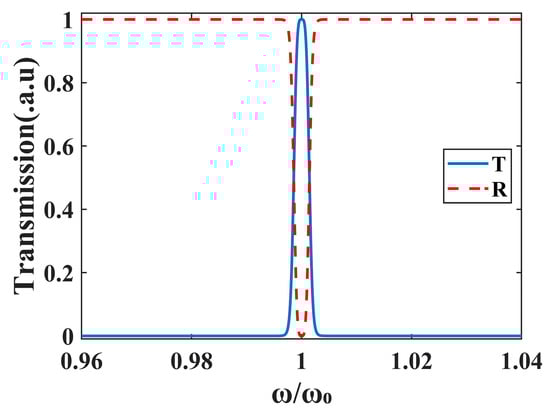 Equation (10) indicates that the transmission under the condition (where m is a non-negative integer) and . Figure 2 presents the transmission of the cascaded triple-ring system versus frequency detuning. At resonance, i.e., when , the transmission reaches its maximum value, while the reflection is minimized. As the frequency detuning increase, the transmission decreases and the reflection increases, which is consistent with energy conservation principles.