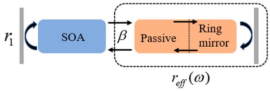 As shown in Figure 3, the proposed ECL can be modeled as a one-dimensional three-section cavity. In this model, the active segment is located on the left side, and the gain chip and its left facet coating are lumped into an effective mirror with a reflectivity of . On the right side, the passive waveguides, the cascaded triple-ring structure, and the Sagnac loop mirror constitute a wavelength-selective passive section, forming a passive external-cavity. As shown in the dashed box in Figure 3, the passive external-cavity is equivalently modeled as an effective mirror. Its effective reflectivity is given by the product of the transfer functions of all passive components: