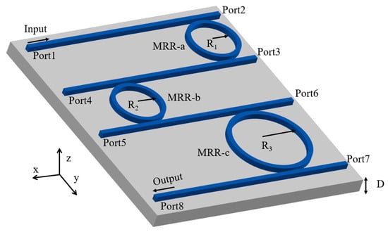 This cascaded triple-ring filter consists of three MRRs and four bus waveguides, as shown in Figure 1. When the wavelength of the light injected from Port 1 matches the resonant wavelengths of MRR-a, MRR-b, and MRR-c, the optical wave is sequentially coupled into all three MRRs and is finally extracted from Port 8, with only negligible power leakage at the other ports. In Figure 1, and represent the amplitude of the input and output waves, respectively (i = 1, 2, 3…12). The phase delays accumulated as the optical field propagates from MRR-a to MRR-b and from MRR-b to MRR-c are denoted by and , respectively, with their values determined by the spacing between adjacent ring cavities. (i = 1, 2, 3…12) characterize the amplitude coupling coefficients between each ring and its adjacent bus waveguides. Since the light energy in each ring resonator propagates in a single direction, the cavity resonance is established by multiple round trips of the traveling wave and no counter-propagating coupling occurs; therefore, the backward coupling coefficients are set to zero, i.e., = 0. , and denote the intrinsic amplitude decay coefficients of MRR-a, MRR-b, and MRR-c, respectively, characterizing the internal losses of the ring cavities. Due to the intentional mismatch in the radii of the three MRRs, their intrinsic resonant frequencies are denoted by , and . The corresponding intracavity resonant mode amplitudes are denoted as , and , associated with MRR-a, MRR-b, and MRR-c, respectively. Based on time-domain coupled mode theory (TCMT) [21,22], denote the frequency of the incident light by . For MRR-a, MRR-b, and MRR-c, the time-domain evolution of the resonant mode amplitudes can be expressed as follows: