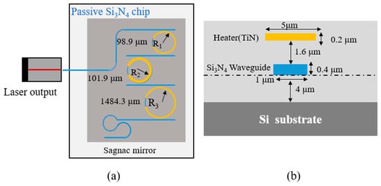 Figure 5a illustrates the schematic of the cascaded triple-ring ECL, which consists of a semiconductor optical amplifier (SOA) chip and a passive Si3N4 chip that are optically coupled via precise alignment. Figure 5b shows a cross-section of the Si3N4 ring waveguide region, where a TiN microheater is integrated above the waveguide. The SOA employs a 400-μm-long multiple quantum wells gain region, where an InP ridge waveguide is etched above the quantum wells to provide optical confinement. The power reflectivity of the SOA facet on the side opposite the external-cavity is 0.3. On the side facing the external-cavity, the SOA facet is combined with a tilted waveguide and an anti-reflection coating, reducing the reflectivity of the facet connected to the Si3N4 chip to 1 × 10−4. The waveguide parameters on the Si3N4 chip are identical to those described in Section 3.1. Considering potential positional drift in the coupling packaging, a coupling loss of 1 dB is set in the simulation. To achieve wavelength tuning, heating electrodes are placed above the ring on the Si3N4 chip. The heaters are made of TiN, with a thickness of 0.2 μm, a width of 5 μm, and a vertical separation of 1.6 μm from the ring. The reflectivity of the Sagnac loop mirror on the passive Si3N4 chip is 0.9. The laser is driven by an injection current applied to the SOA gain chip. The light from the SOA is coupled into the passive Si3N4 chip, passes through the cascaded triple-ring structure for wavelength selection, is reflected by the Sagnac loop mirror, and then re-enters the SOA to provide optical feedback, with part of the light is output. The structural parameters are summarized in Table 2.