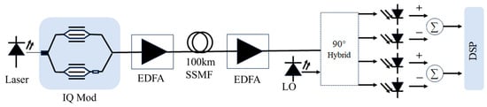 Figure 6 shows the schematic of the simulation setup. At the transmitter, lasers of different linewidths are used to conduct comparison tests at 1 MHz, 100 kHz, and 193 Hz. In the numerical simulation, a continuous-wave laser with center frequency 193.1 THz and output optical power of 7 dBm is modulated into optical baseband signals by an IQ Mach–Zehnder modulator. The modulated signal is amplified by an erbium-doped fiber amplifier (EDFA) with a gain exceeding 20 dB, and then transmitted through 100 km standard single-mode fiber. At the receiver, the transmitted signal is coherently mixed with the local oscillator (LO) in a 90° optical hybrid. The four output ports are detected by two balanced photodetectors (PDs), and the resulting electrical signals are sampled by a high-speed analog-to-digital converter (ADC) and processed by digital signal processing (DSP) algorithms, including IQ imbalance compensation, chromatic dispersion compensation, frequency offset estimation, and carrier phase recovery.