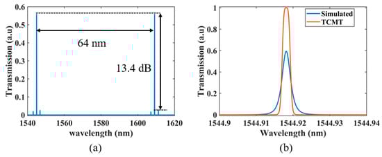 Based on the proposed cascaded triple-ring filter structure, we perform simulations to characterize its transmission spectrum. The estimated insertion losses of the three MRRs are approximately 0.21 dB for MRR-a, 0.21 dB for MRR-b, and 1.91 dB for MRR-c. Figure 7a shows the simulated transmission spectrum of the proposed cascaded triple-ring filter in the wavelength range of 1540–1620 nm, where the device exhibits an insertion loss of 2.64 dB, corresponding to a peak transmittance of approximately 0.55. The minimum power difference between the main resonance peak and the adjacent side mode is about 13.4 dB, and the FSR is approximately 64 nm. Figure 7b plots the transmission spectra of the triple-ring filter from simulation and from the TCMT theory. The blue curve shows the spectrum simulated with the cascaded triple-ring filter, and the orange curve shows the theoretical spectrum calculated using the TCMT Equation (10). The simulated peak transmittance is lower than the theoretical maximum predicted by the TCMT model for two reasons. First, to simplify the derivation of the theoretical transmission spectrum, we intentionally neglect the intrinsic loss terms in the rings (i.e., for ) in the analytical TCMT formulation. Second, the numerical simulations include waveguide propagation loss, whereas this loss is neglected in the simplified analytical TCMT model, leading to a reduced peak transmittance in simulation.