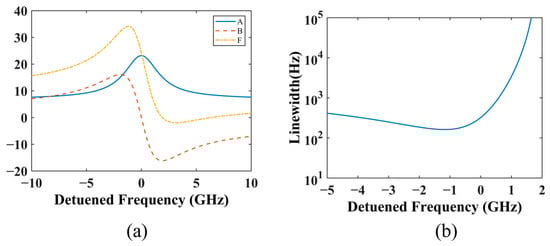 Based on the theoretical model derived in Section 2 and the design parameters listed in Table 1 and Table 2, the three coefficients , , and are calculated as functions of frequency detuning from the lasing wavelength (1570 nm), as shown in Figure 8a. The corresponding Lorentzian linewidth is then evaluated using Equation (19) and plotted in Figure 8b, which indicates that the laser linewidth can be compressed to the sub-kHz level.