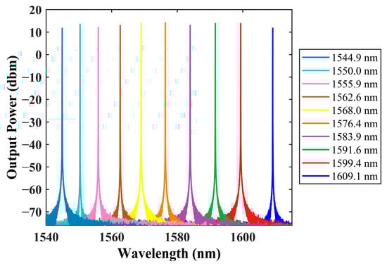 Next, we investigate the tuning characteristics of the laser by sweeping the heaters of the MRRs to obtain the tuning map. During the measurement, the gain current is fixed at 100 mA. Figure 10 shows optical spectra at different operating wavelengths. A tuning range of 64 nm is achieved with SMSR exceeding 80 dB, and the linewidth remains within the kilohertz range across the full tuning span. Detailed simulated values of linewidth, SMSR and output power at representative wavelengths are summarized in Table 4.