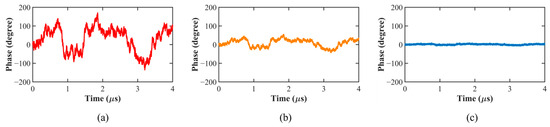 To analyze the impact of laser linewidth on system phase noise, we employ Wiener-process-based numerical simulations to study time-domain phase fluctuations under different linewidths. Figure 11 shows instantaneous phase evolution within a 4 μs observation window for linewidths of 1 MHz, 100 kHz, and 193 Hz. As linewidth decreases, phase excursions become significantly less pronounced, confirming that reducing laser linewidth effectively suppresses system phase noise.