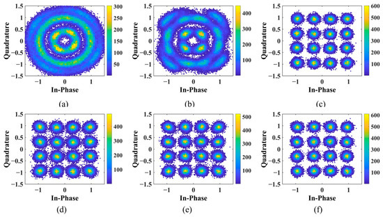 Figure 13 shows the corresponding 16QAM constellations for the same linewidth conditions. Panels (a)–(c) present the constellations before carrier phase recovery for linewidths of 1 MHz, 100 kHz, and 193 Hz, respectively. As the linewidth is reduced from 1 MHz to 193 Hz, the constellations evolve from severely broadened and strongly mixed inner and outer rings to compact and separated symbol points, indicating the significant improvement in phase-noise tolerance provided by the narrow-linewidth laser. Panels (d)–(f) show the corresponding constellations after BPS recovery. For the higher-order 16QAM modulation format, the results show that, without employing the BPS algorithm, the proposed 193 Hz narrow-linewidth laser can achieve a BER as low as 7.2493 × 10−5, whereas the BER of the 1 MHz broad-linewidth laser is 0.6556, rendering the system unusable. After enabling BPS-based carrier phase compensation, the 193 Hz narrow-linewidth laser still maintains outstanding performance with a BER of 5.3416 × 10−5. Although the BER of the 1 MHz linewidth laser is improved from 0.6556 to 1.5 × 10−3, it remains above that of the narrow-linewidth case, corresponding to a performance gap of more than one order of magnitude. These results clearly demonstrate that reducing the laser linewidth is an effective way to enhance the performance of high-order coherent modulation systems. As the linewidth decreases, phase-noise-induced constellation blurring and rotation are strongly suppressed, the BER is reduced, and the system obtains a larger performance margin.