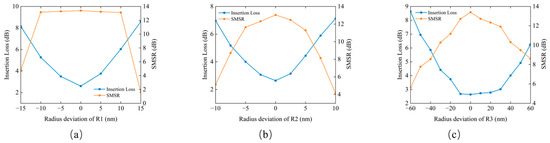 Fabrication tolerance analysis of the triple-ring filter: (a) insertion loss and SMSR versus the radius deviation of R1; (b) insertion loss and SMSR versus the radius deviation of R2; (c) insertion loss and SMSR versus the radius deviation of R3.