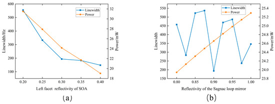 In this context, our ECL offers a more balanced performance profile. First, the coupling gap between the bus-waveguide and each ring resonator is set to 650 nm. Choosing a higher coupling gap would decrease the laser linewidth by increasing the effective cavity length and photon lifetime through a larger number of round trips in the MRRs; however, too weak coupling would reduce the usable tuning range, because the higher loss in the feedback path makes the lasing mode more sensitive to broadband feedback such as scattering and facet reflections. Moreover, reducing the radius difference between the first two rings could be increase the FSR and thus extend the tuning range, but a smaller radius difference leading to a lower SMSR. Second, the mirror reflectivity affects both the laser linewidth and the on-chip output power. As shown in Figure 15a, increasing left facet reflectivity further narrows the linewidth but reduces the on-chip output power. This is because a higher reflectivity enhances intracavity feedback and increases the photon lifetime, whereas the longer effective optical path leads to more accumulated waveguide propagation loss before reaching the output. Considering the trade-off between linewidth and output power, we set the left facet power reflection to 0.3. Figure 15b shows the intrinsic linewidth and on-chip output power versus the Sagnac loop mirror reflectivity Rmirror ranging from 0.8 to 0.99. As Rmirror increases, the on-chip output power slightly increases. The lowest linewidth is obtained at an Rmirror value of 0.9, while a similarly low value can also be achieved near 0.975 together with a higher output power. However, achieving such a high reflectivity near 0.975 typically requires more stringent device conditions, such as a coupler splitting ratio closer to the ideal value and lower loop loss with reduced fabrication deviations. Therefore, we use an Rmirror value of 0.9. Furthermore, increasing the radius of the third ring improves the SMSR by enhancing the spectral selectivity of the external cavity, but the longer ring path also introduces additional propagation loss and reduces the on-chip output power. Although the tuning range of our ECL is not the widest among the compared designs, it remains sufficient for many WDM and sensing applications [29]. More importantly, our laser achieves an ultranarrow intrinsic linewidth of 193 Hz, an SMSR exceeding 80 dB and an on-chip output power of 24 mW at 1550 nm, with the SMSR being the highest among the listed schemes. Compared with prior reports, our approach simultaneously maintains a high SMSR and an ultranarrow linewidth without sacrificing output power, offering a more balanced and practically attractive performance trade-off.