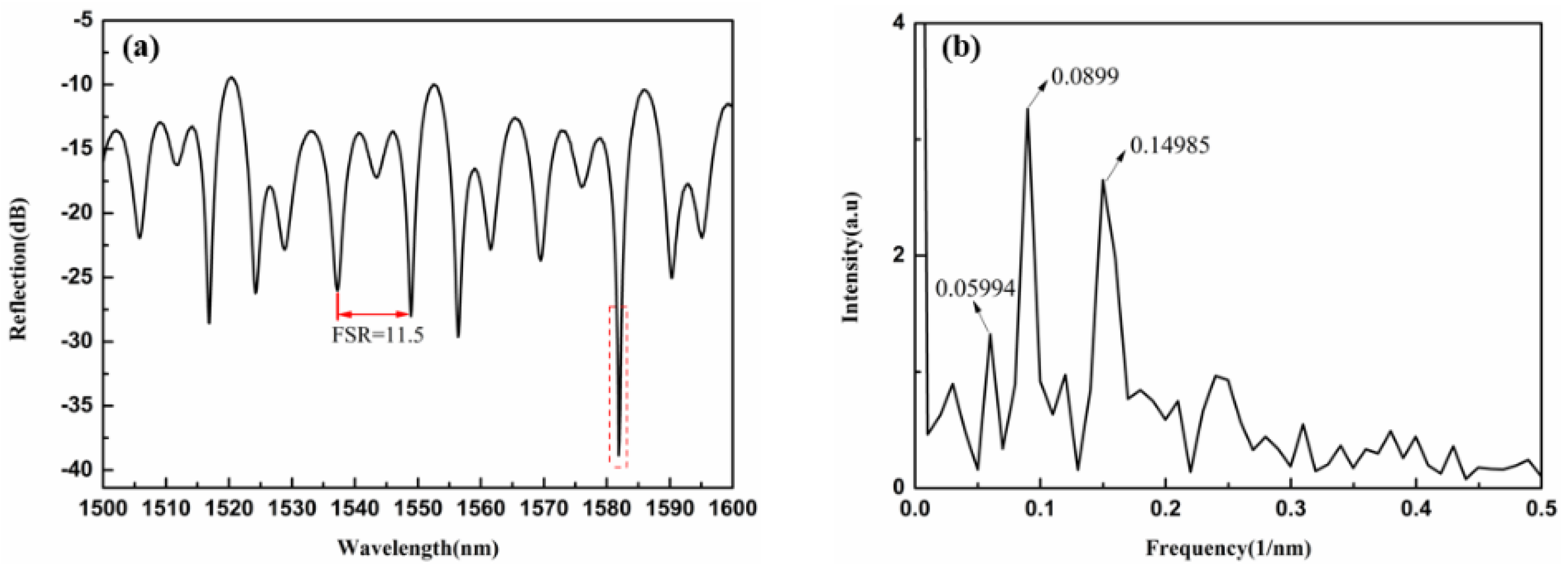 Figure 6a, we can see that the free spectrum range is narrower, and the spectrum is no longer a simple F–P interference pattern. To analyze the component of the spectrum in