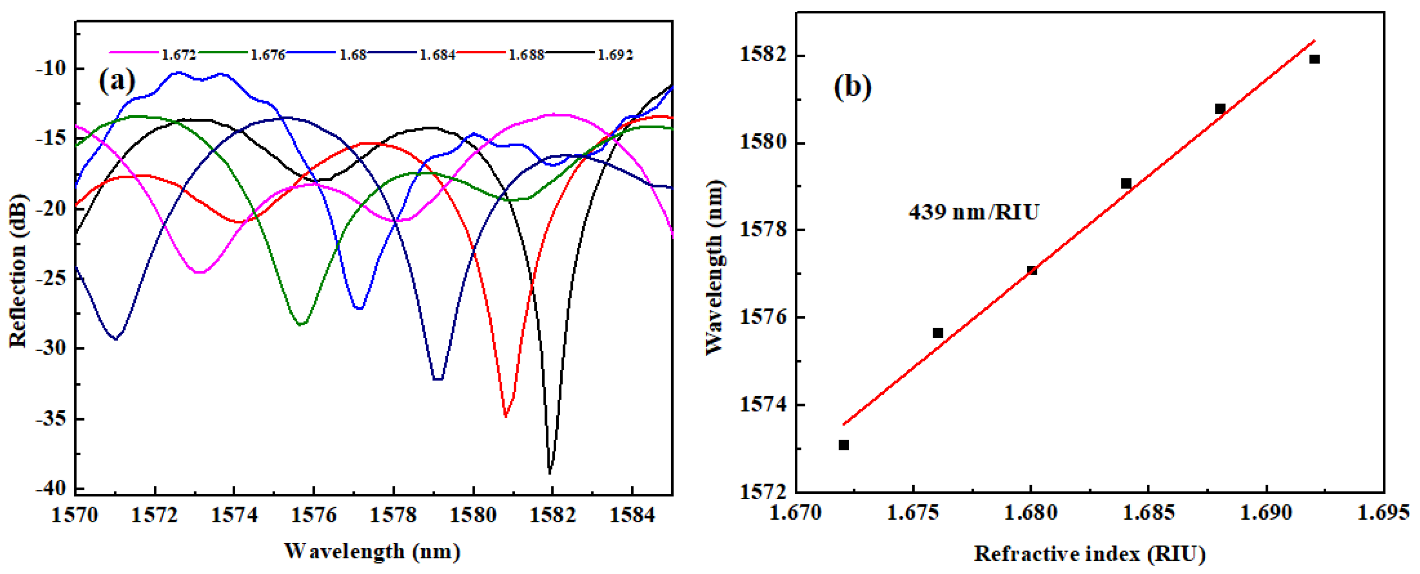 Figure 11a shows the spectral response of the device as the liquid RI is increased from 1.672 to 1.692. It reveals a red shift in the spectrum with increasing liquid RI. Meanwhile, the Q-factor becomes higher as RI increases.