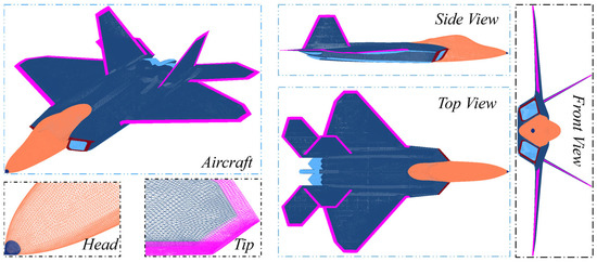 In this study, a certain aircraft model is selected as the research subject. To ensure the accuracy of the electromagnetic calculations, the high-fidelity geometric reconstruction and precise modeling details of this aircraft are based on the methodologies established in Ref. [35]. This foundational model is then utilized to evaluate the radar wave scattering reduction effectiveness of the absorptive material obtained through reverse engineering. Figure 1 illustrates the mesh discretization diagram of the aircraft model based on these precise parameters.