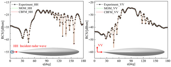 The recovered geometric shape of the amygdala was discretized into a mesh to obtain an electromagnetic grid. Radar cross section calculations were performed using the moment method [40,41,42] and the characteristic basis function method. The final results are shown in the figure. The accuracy of the characteristic basis function method closely mirrors that of the moment method, validating the algorithm’s precision. By comparing simulation results with actual measurements, the accuracy of the reconstructed amygdala model was verified to meet requirements. In Figure 2, “HH” and “VV” represent the horizontal and vertical polarization modes of the radar waves, respectively.