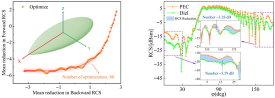 When the optimization point is located at the lower left (as shown in Figure 4), the mean forward radar cross section reaches the target value while the mean backward radar cross section is minimized. Analysis of Figure 4 indicates that applying the optimized absorptive material behind the amygdala reduces the mean forward radar cross section by approximately −5.59 dB and the mean backward radar cross section by approximately −3.28 dB.
