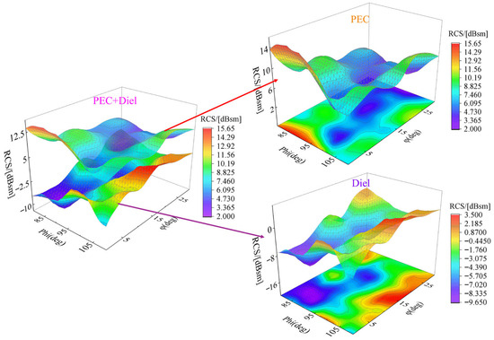 The radar frequency is chosen at 425 MHz (within the P-band range of 300 MHz to 1 GHz). Incident elevation angles are set to −20°, −15°, −10°, −5°, 0°, 5°, and 10° (corresponding to Phi = 110°, 105°, 100°, 95°, 90°, 85°, and 80°, respectively), while azimuth angles sweep from 0° to 360°. In the figures, “Diel” denotes the case with the dielectric absorber coating, and “PEC” denotes the bare metallic configuration.
