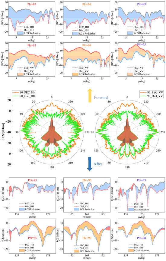 - After applying absorptive materials, the average forward RCS reduction in the P-band for the aircraft ranged from a maximum of −13.97 dB to a minimum of −8.89 dB. The average rearward RCS reduction ranged from a maximum of −5.03 dB to a minimum of −2.80 dB.