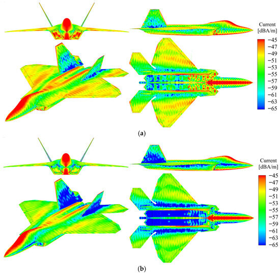 Under horizontal polarization radar conditions with an incidence angle of 0° and azimuth angle of 0°, Figure 7 illustrates the surface current distribution comparison for a specific aircraft model that is coated with and without absorptive materials. The top view employs a sectional representation of the airframe structure to more clearly reveal the current distribution characteristics within the intake duct cavity, emphasizing the variation patterns of surface currents within the cavity.