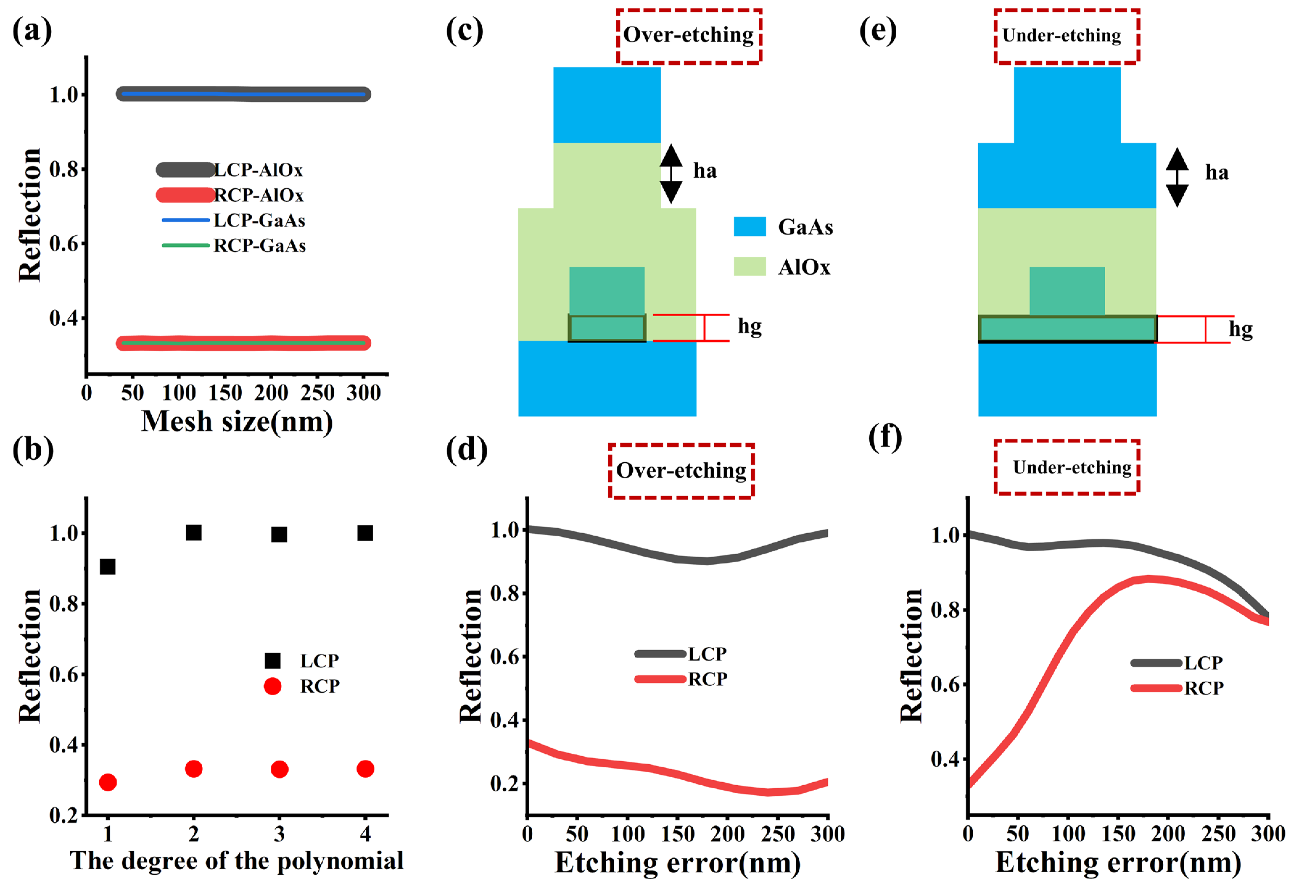 - Cheng, B.; Jiang, B.; Zou, Y.; Song, G. Ultrahigh-Reflectivity Circularly Polarized Mirrors Based on the High-Contrast Subwavelength Chiral Metasurface. Photonics 2024, 11, 923. [Google Scholar] [CrossRef]
